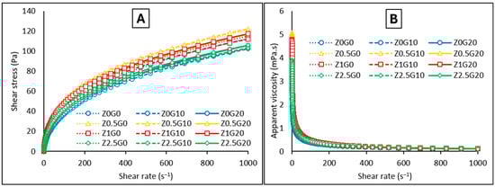 (A) Flow curves and (B) viscosity-shear rate profiles of pectin film solution with 0% ZnO-NPs/0% glycerol (Z0G0) and 2.5% ZnO-NPs/20% glycerol (Z2.5G20).