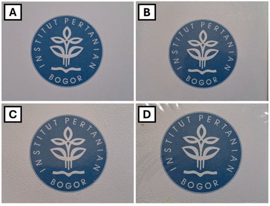 Visual appearance of the resulting films: (A) paper without film, (B) paper with film containing 0% ZnO NPs and 0% glycerol film, (C) paper with film containing 0.5% ZnO-NPs and 0% glycerol, (D) paper with film containing 0% ZnO-NPs and 20% glycerol.