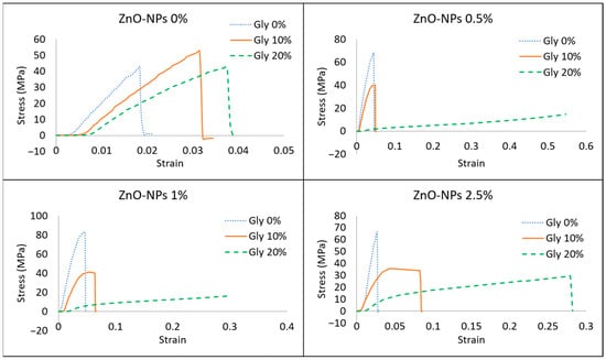 Table 5 and Table 6 summarize the mechanical properties of the bionanocomposite film, with their corresponding stress–strain curves displayed in Figure 6. The interaction between ZnO-NPs and glycerol had a significant effect (p < 0.05) on both the tensile strength and elongation at break of the films. The tensile strength (TS) value represents the maximum stress a film can withstand before breaking or tearing; meanwhile, elongation at break (EB) is a parameter of film plasticity that measures the ability of the film to withstand deformation without cracking.