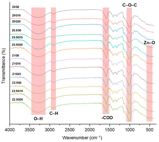 FTIR spectroscopy was employed to analyze molecular structure of the films (Figure 7). A broad band at 3300 cm−1 corresponds to hydrogen bonds formed between O-H groups of pectin and glycerol in films with added glycerol [24,56]. Other key pectin bands include C-H alkane stretching at 2792–2913 cm−1 and the strong asymmetric C-O-O stretching at ~1590 cm−1. The C-O-C saccharide structure’s stretching absorption appears near ~1000 cm−1 [60]. These results agree with [4,10,24,56]. Additionally, peaks in the range of 400–550 cm−1 confirm Zn-O stretching vibrations from ZnO-NPs [61].