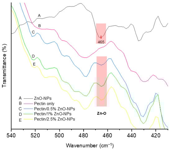 FTIR also verified successful ZnO-NPs incorporation in the films. Figure 8 shows spectra for pure pectin film, pectin films with ZnO-NPs at concentrations of 0.5%, 1.0%, and 2.5%, alongside the spectra of previously fabricated ZnO-NPs. The ZnO-NPs spectrum exhibited a distinct absorption band at approximately 465 cm−1, owing to the stretching vibrations of Zn–O bonds. Notably, this characteristic peak was also present in all pectin film formulations containing ZnO-NPs, indicating successful dispersion of the nanoparticles within the polymer matrix. In contrast, this absorption band was absent in the control film without ZnO-NPs addition. These observations are in agreement with the findings of Suyatma et al. [63] who reported a similar Zn–O characteristic peak at 465 cm−1 in chitosan-based films incorporated with 1% ZnO-NPs, which was not observed in the control films.