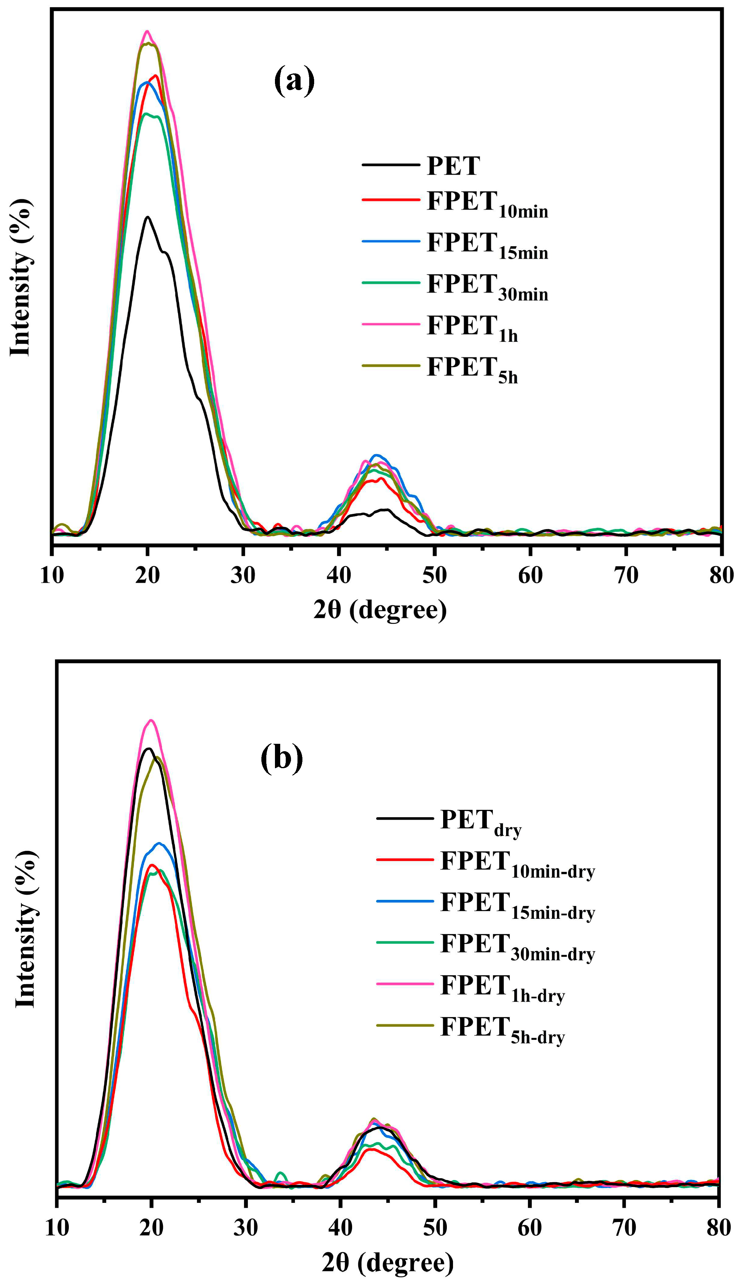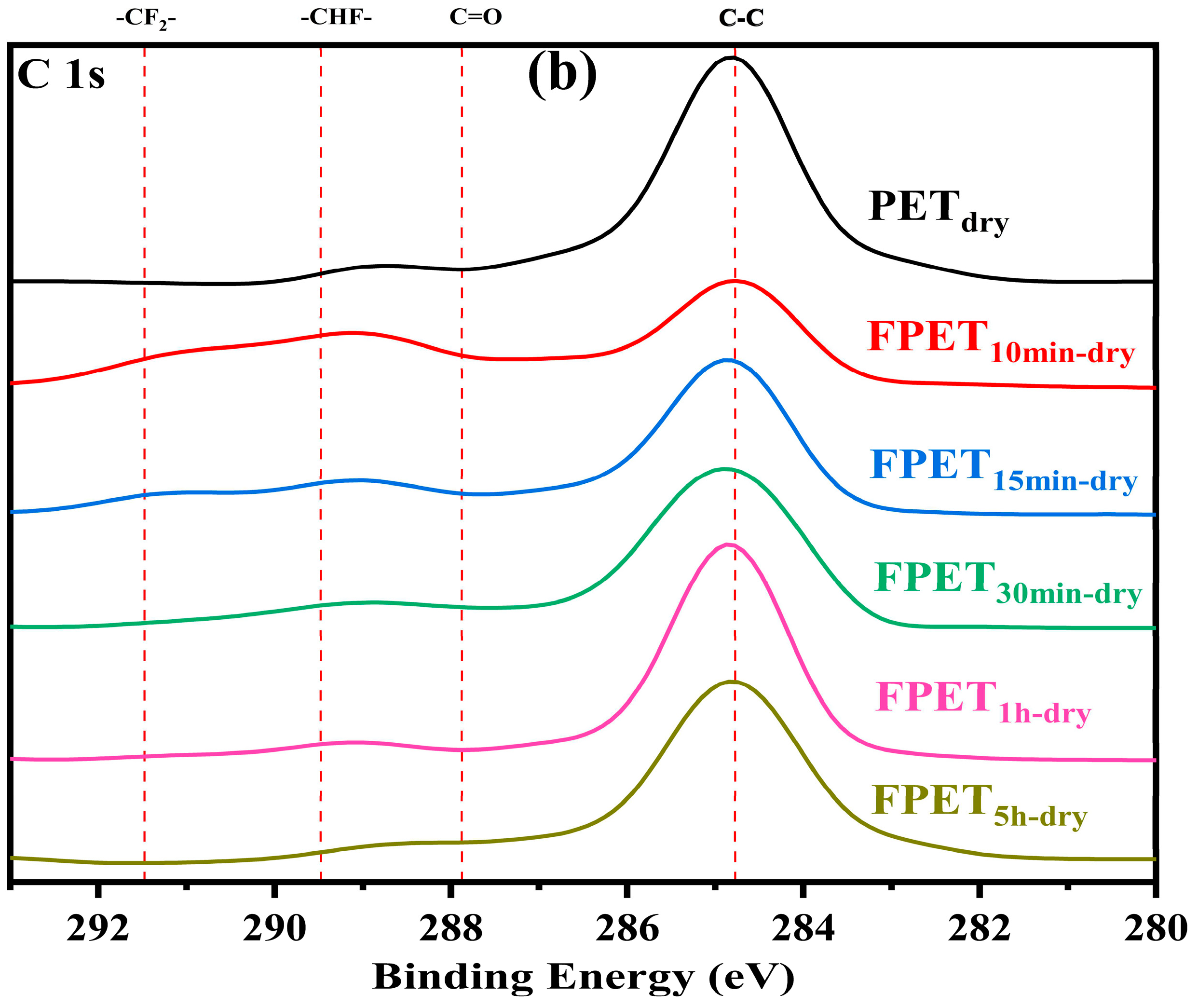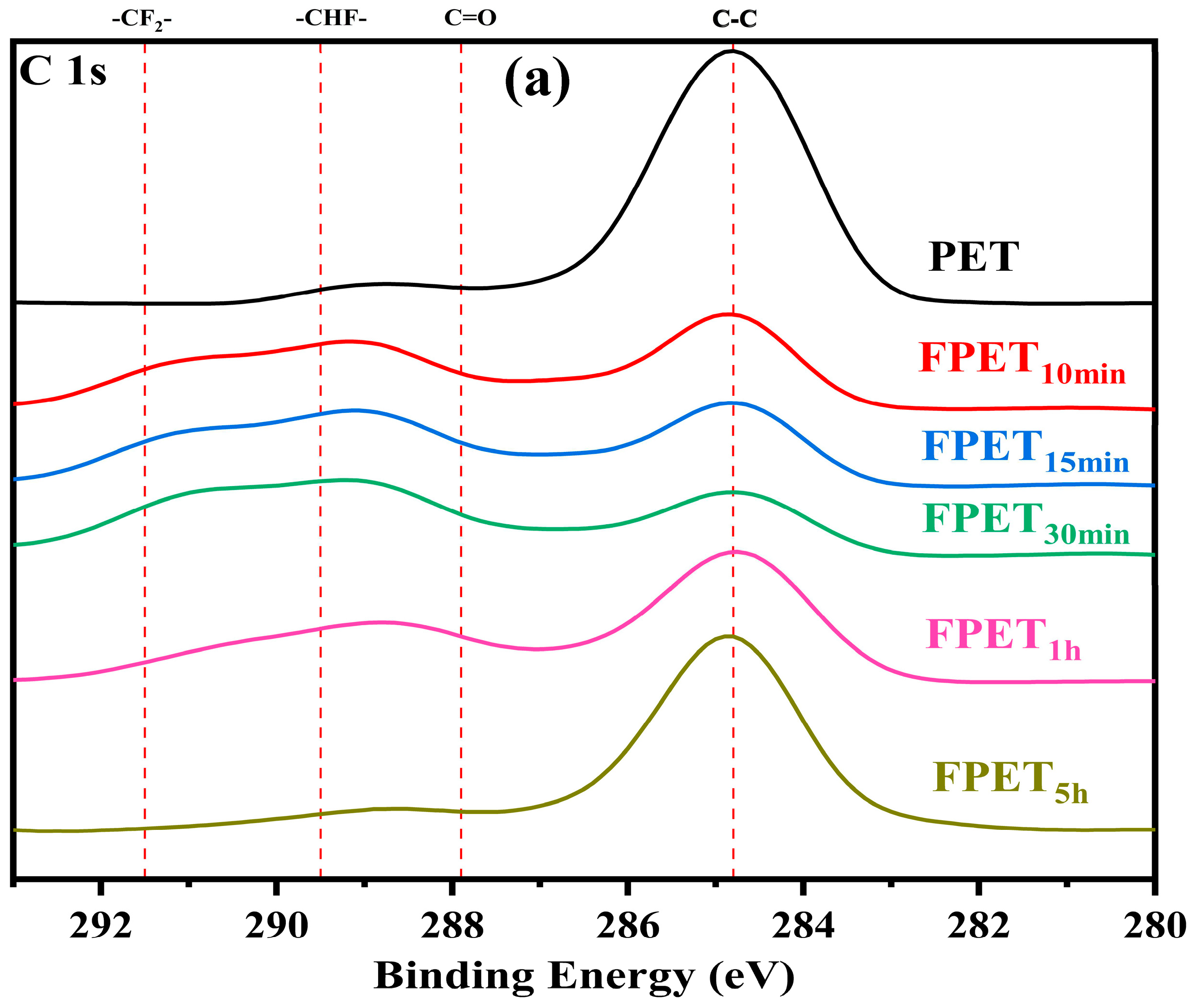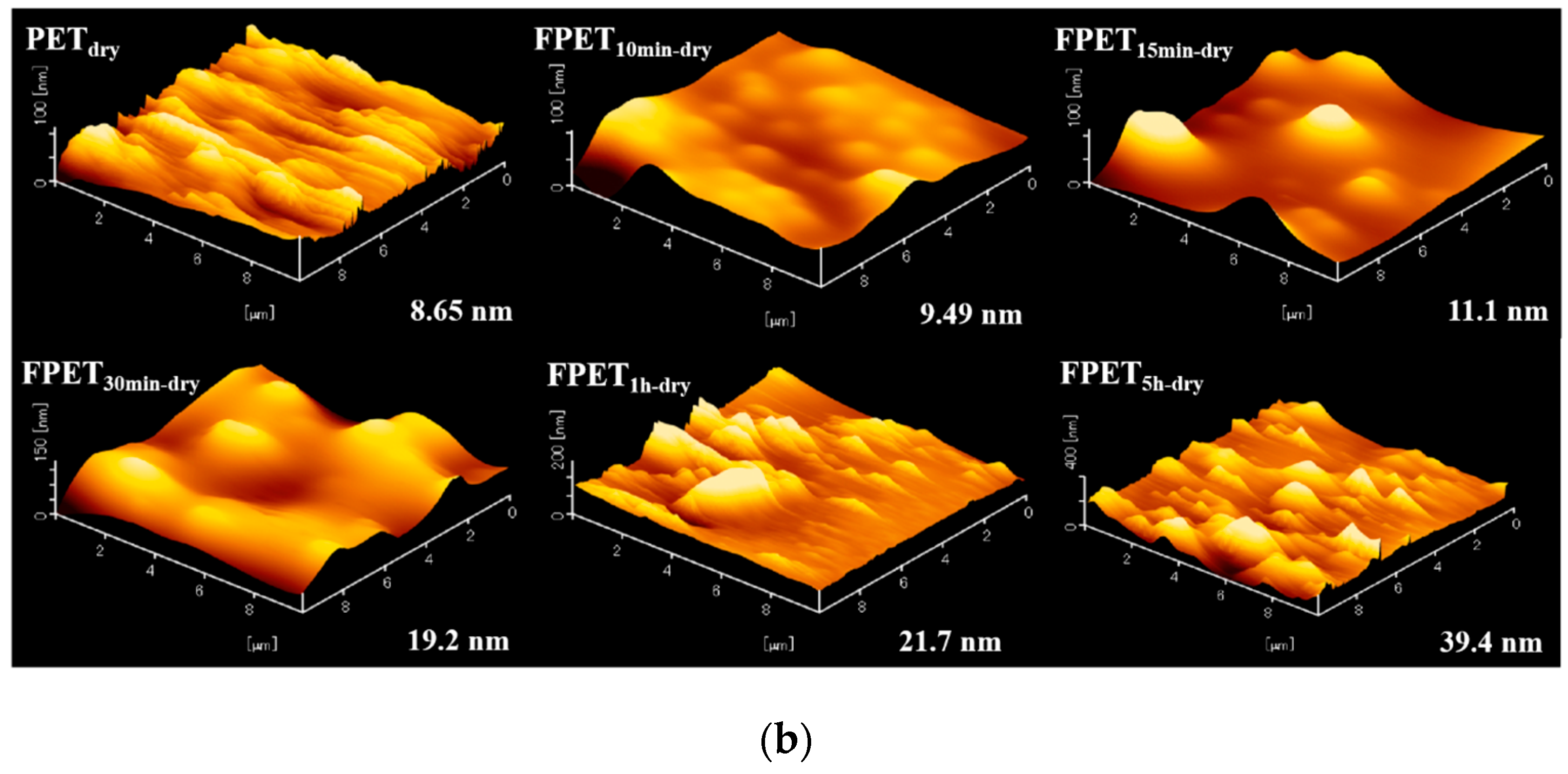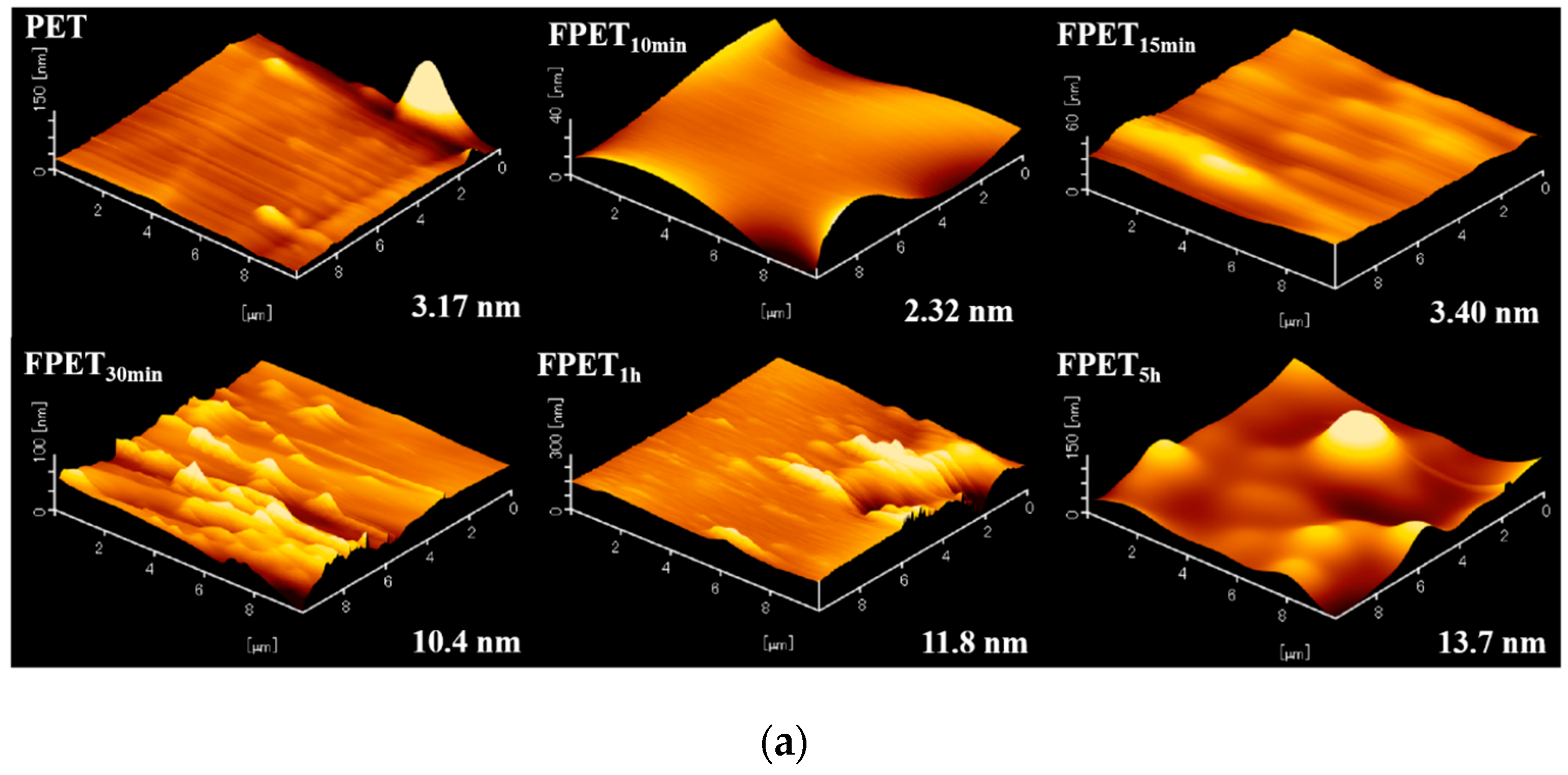 - Liu, Y.; Chen, Q.; Du, X.; Li, L.; Li, P. Surface modification of polyethylene terephthalate films by direct fluorination. AIP Adv. 2018, 8, 125333. [Google Scholar] [CrossRef]