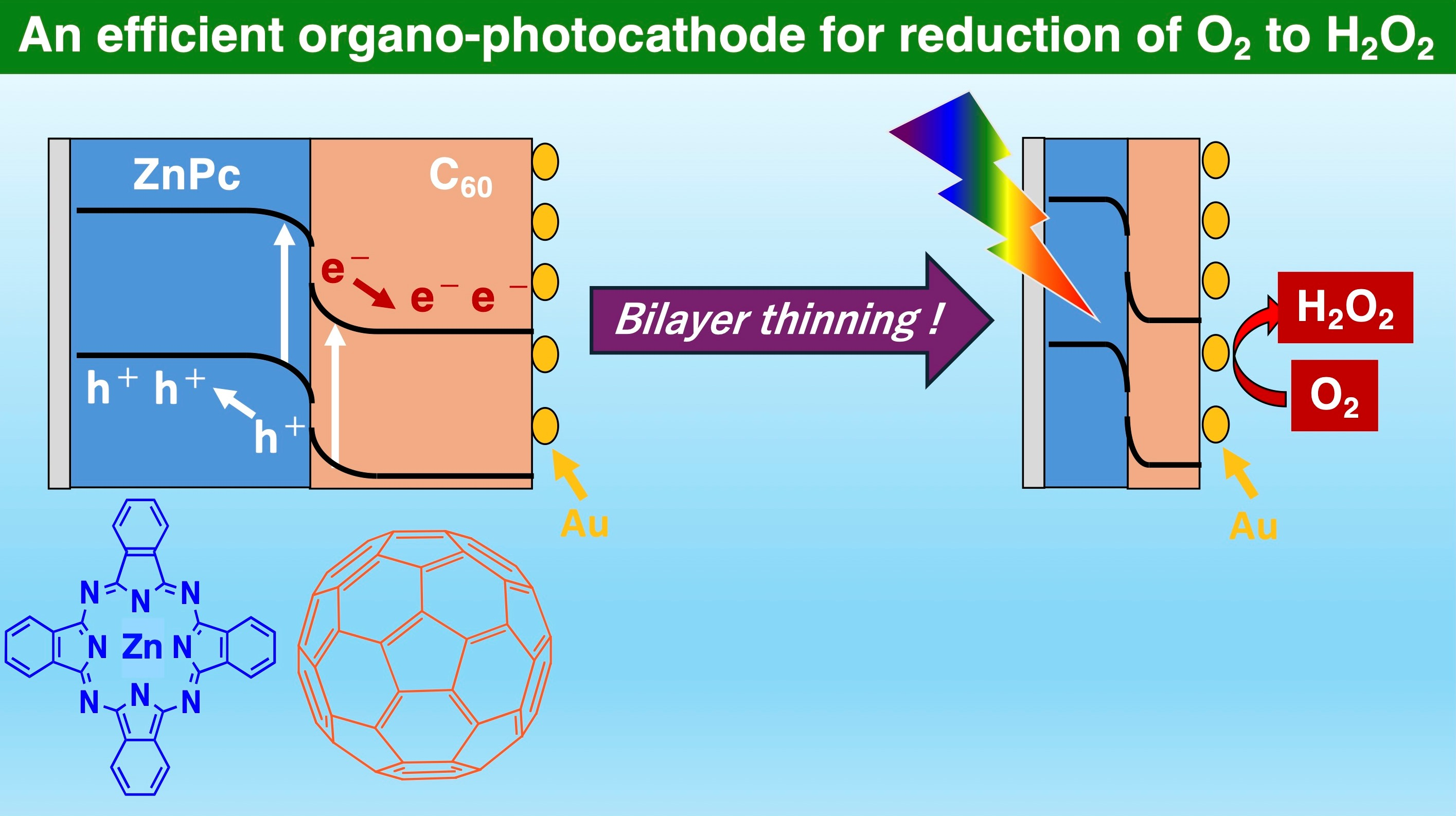 This study investigated the effect of the thickness of a ZnPc/C60 bilayer for the development of efficient photocathodes capable of H2O2 formation from O2. The results demonstrate that a thin ZnPc/C60 bilayer acts as a superior photocathode when Au loaded on the C60 surface is employed as a co-catalyst. The thin bilayer reduced O2 to H2O2 by approximately 3.4 times more than the thick bilayer used in our previous study. This result can be attributed to the high concentration of electrons available for H2O2 formation on the Au co-catalyst, which is achieved through a series of efficient photophysical processes that occur within the thin bilayer.