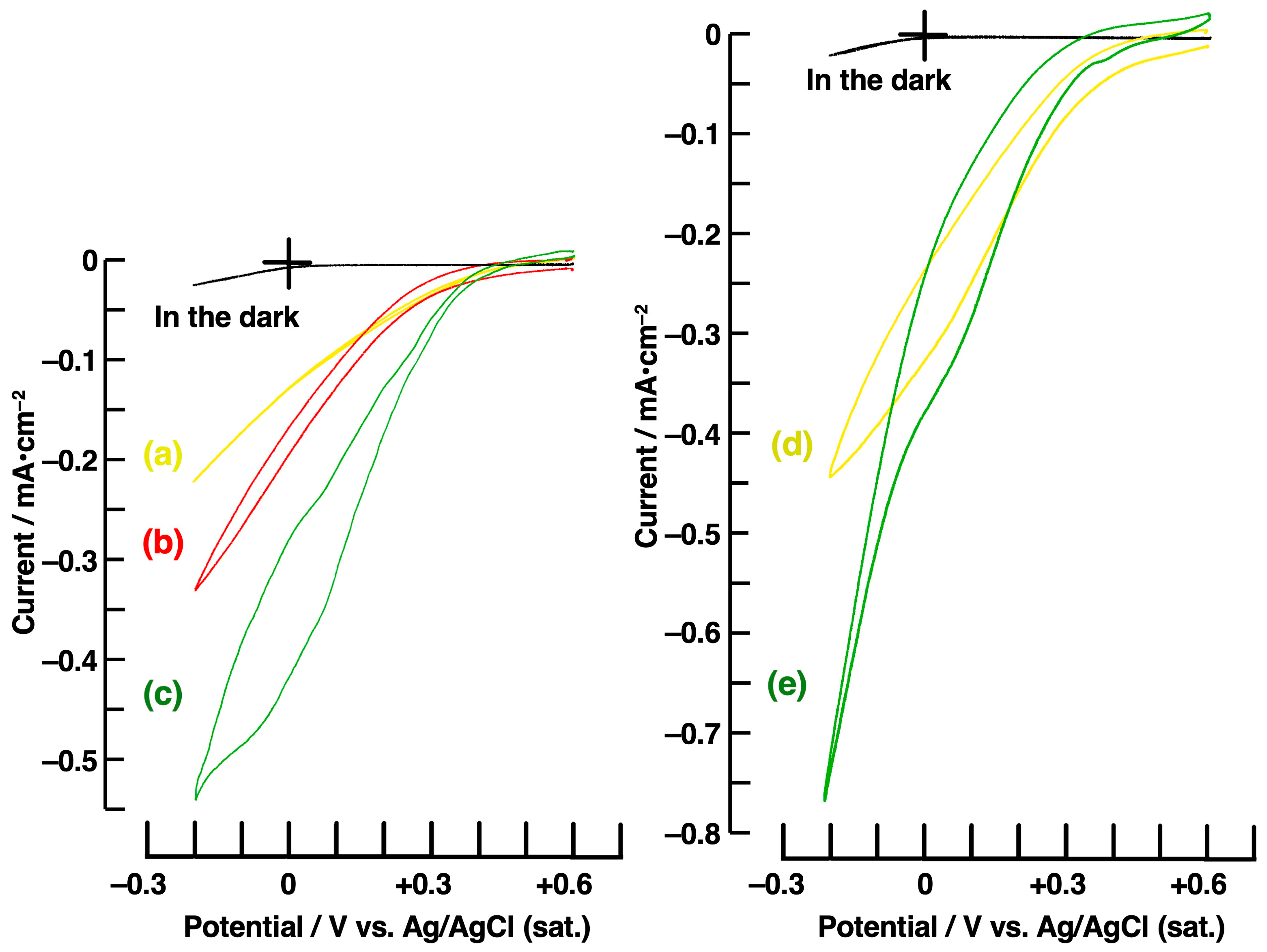 Figure 1. Cyclic voltammograms of ZnPc/C60-Au under O2 atmosphere. Electrolyte solution: aqueous H3PO4 solution (pH = 2); scan rate: 20 mV/s; C60 film thickness in (ac) (with constant ZnPc thickness of ca. 70 nm): (a) 123 nm, (b) 46 nm, (c) 13 nm; ZnPc film thickness in (d,e) (with constant C60 thickness of ca. 6~7 nm): (d) 115 nm, (e) 11 nm; light intensity: 100 mW/cm2; irradiation direction: from back of ITO-coated face.