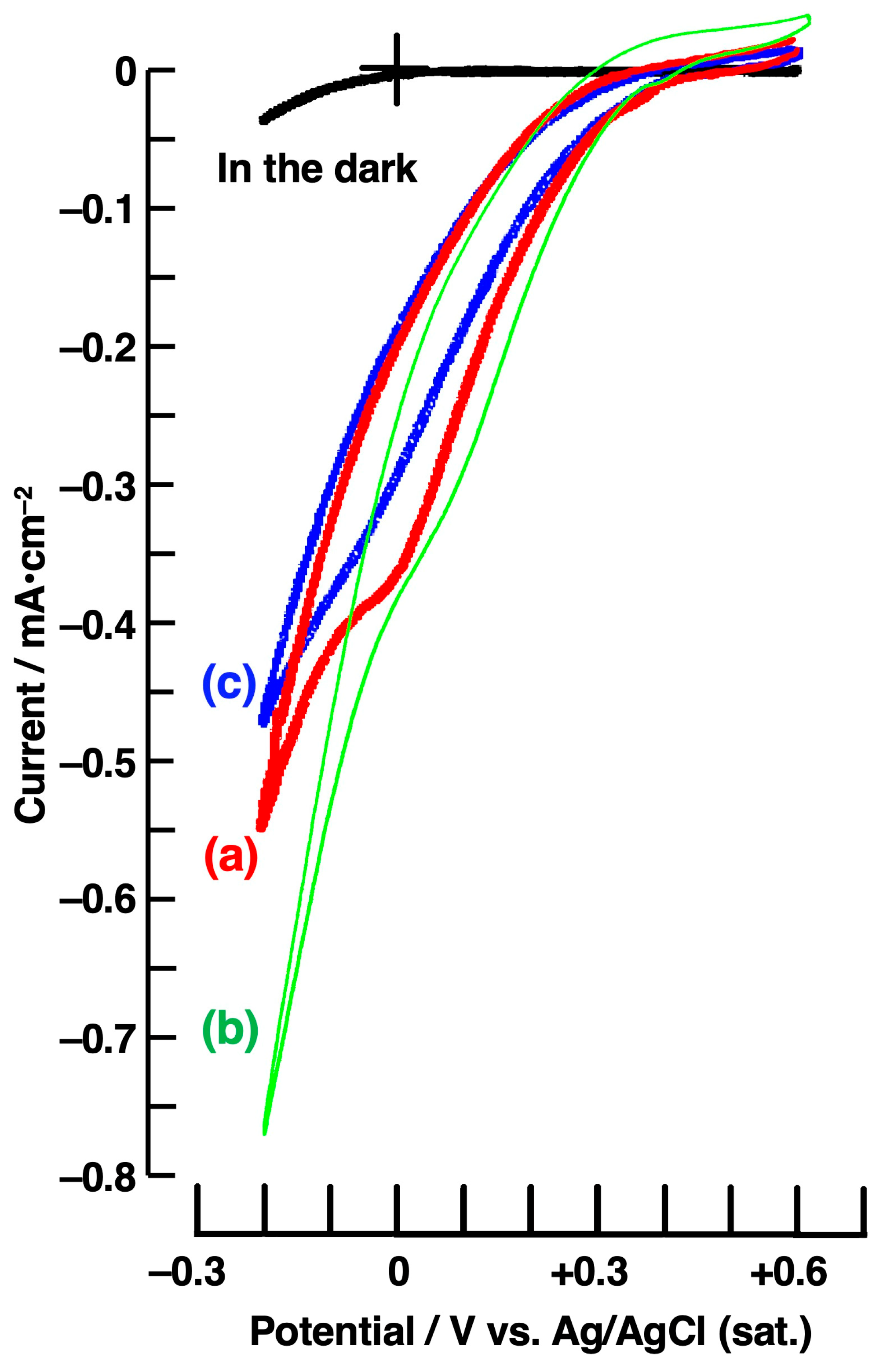 Figure 3. CVs of ZnPc/C60-Au for O2 reduction with changing the amount of charge passed during Au deposition ((a), 0.02 C; (b), 0.04 C; (c), 0.05 C). Electrolyte solution: aqueous H3PO4 solution (pH = 2); scan rate: 20 mV/s; film thickness of ZnPc/C60 bilayer: 11 nm for ZnPc and 6 nm for C60; light intensity: 100 mW/cm2; irradiation direction: from the back of the ITO-coated face.