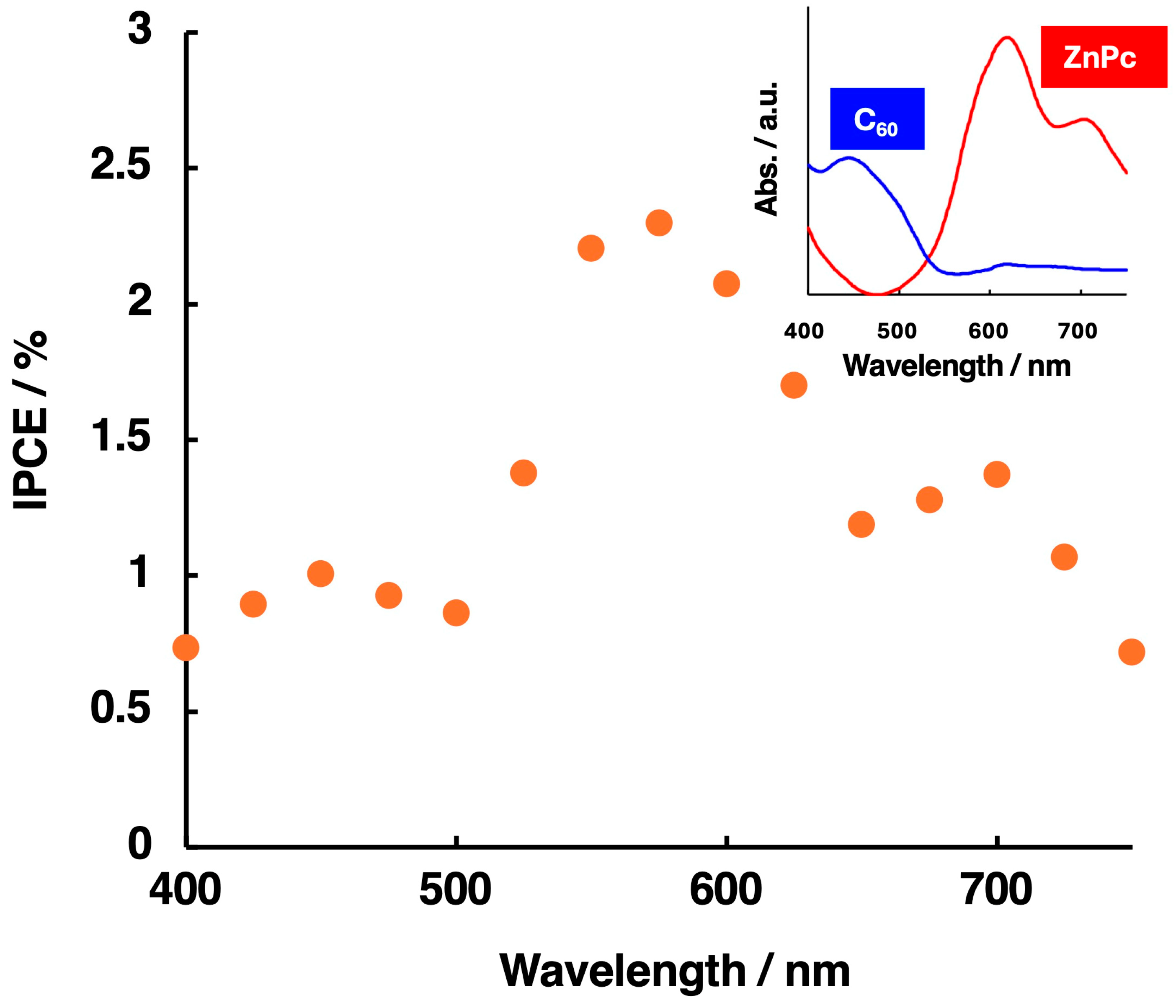 Figure 4. Action spectrum of ZnPc/C60-Au photocurrents obtained under O2 atmosphere. The inset shows the typical absorption spectra of single-layer ZnPc and C60. Film thickness of ZnPc/C60 bilayer: 12 nm for ZnPc and 3 nm for C60; applied potential: −0.1 V vs. Ag/AgCl; light intensity: 0.1 mW/cm2; electrolyte solution: aqueous H3PO4 solution (pH = 2).