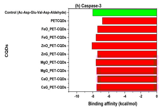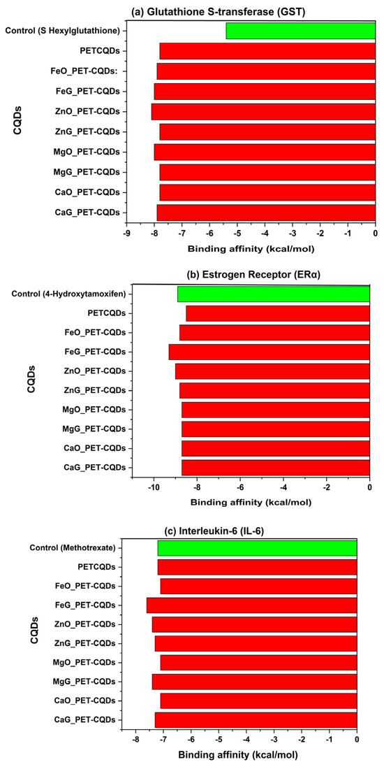 - GST interacted best with PET-CQDs, CaO_PET-CQDs, MgG_PET-CQDs, and FeG_PET-CQDs.