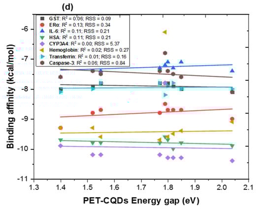 Multiple linear regression between DFT results of PET-CQDs (a) binding energy, (b) highest occupied molecular orbital [HOMO] (c) lowest unoccupied molecular orbital [LUMO] and (d) energy gap against binding affinities for the different proteins. R2 = coefficient of determination; RSS = residual sum of squares.