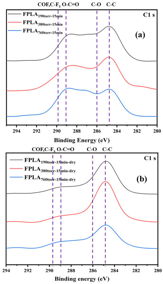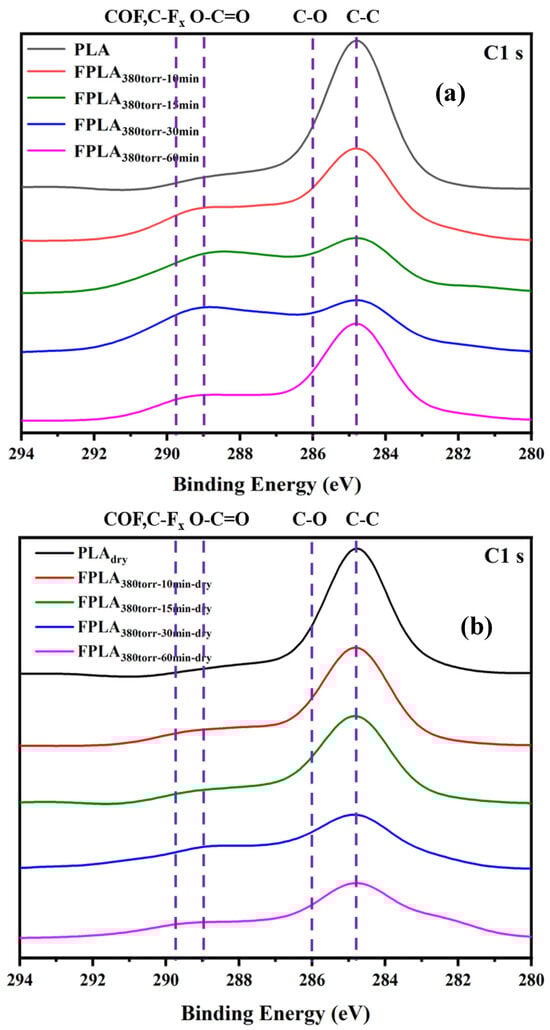 Figure 1 shows the FT-IR spectra of (a) untreated and fluorinated and (b) dried samples for different reaction times. The peaks of -CH2- at 2928 cm−1 and -CH- at 2853 cm−1 in the spectra of the fluorinated and dried samples were both weakened [27,28]. In addition, after fluorination, a very obvious -OH peak appears in 3500–3200 cm−1 and the intensity increased with the increase in fluorination time. After drying, the temperature increased, causing -OH to turn into H2O and leave the surface. The peak intensity decreased. For PLA, the peak at 1770 cm−1 is attributed to C=O and the peak at 1260 cm−1 is attributed to the ester group O-C=O [29,30]. After fluorination, the O-C=O peak intensity decreased, but the C=O peak, which shifted to 1750 cm−1, did not change significantly. This may be because fluorination leads to the cleavage of O-C=O and the formation of -COF. -COF is easily converted to COOH via hydrolysis. As a result, the O-C=O peak intensity decreased, and the C=O peak shifted to a lower wavelength. During drying, parts of -COOH will be decarboxylated or regenerated into O-C=O. Therefore, the peak intensity of C=O decreased overall, whereas the intensity of the O-C=O peak increased slightly [27,31]. The C-Fx stretching vibration peak appears at 1000–1210 cm−1 [26,32]. This indicates that the PLA was partially fluorinated. As the fluorination time increased, the intensities of the -CH- and -CH2- peaks decreased. However, the C-Fx peak first increased and then decreased. This is because fluorine radicals continuously attack the carbon chain, generating CF4 that escapes from the surface. Therefore, the C-Fx intensity did not continue to increase. After drying, the peak intensity of C-Fx continued to decrease. This may be due to the thermal effect, which causes C-F and C-F2 to continue converting into CF4 and escaping on the surface. Consequently, the peak intensity of C-Fx decreased further. For the dried samples (b), the peak intensities did not change significantly, indicating that heat treatment of the surface after fluorination did not alter the surface functional groups. However, the intensities of all peaks decreased after drying. This is likely due to the thermal effect, which causes some fluorine atoms on the surface to continue reacting and generating CF4, resulting in a further decrease in the peak intensity.