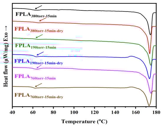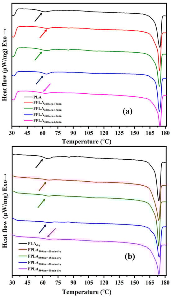Figure 7 shows the DSC spectra of (a) untreated and fluorinated and (b) dried samples for different reaction times and Table 1 is the Tg values of all samples. For the fluorinated samples, Tg was higher than that of PLA [35,36]. The Tg both FPLA380torr-15min and FPLA380torr-30min are higher than 60 °C. The change in Tg was consistent with that of the surface fluorine content, which first increased and then decreased. This may be because fluoride (C-Fx) is formed on the sample surface, increasing the surface polarity and thus increasing the Tg value. Because fluorine increases over time, generating CF4 that overflows from the surface, the Tg values trend initially increases and then decreases.
