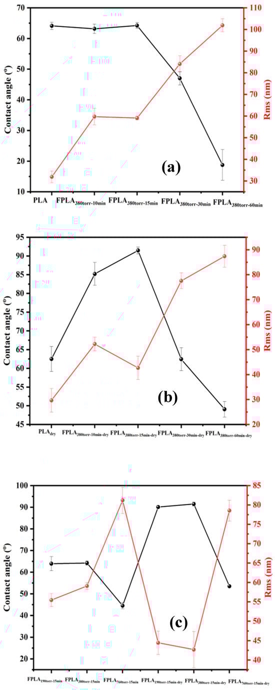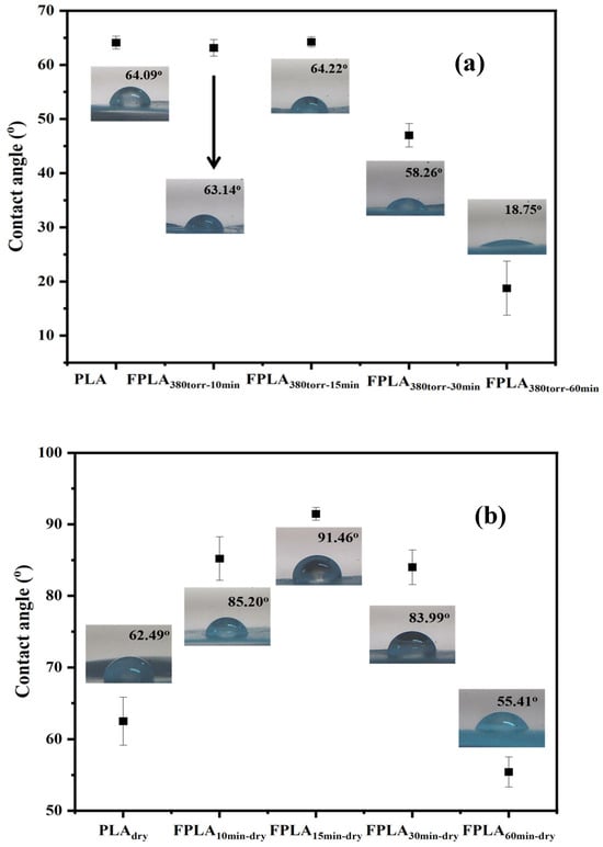 The WCA can directly observe whether the surface of the film is hydrophilic or hydrophobic. Figure 9 shows the WCA of (a) untreated and fluorinated and (b) dried samples for different reaction times and Table 3 is the WCA values of all samples. The WCA of the untreated PLA film, the WCA is 64.09°. However, after fluorination, the WCA of all fluorinated samples decreased. For the fluorinated samples, FPLA380torr-10min and FPLA380torr-15min, the values changed; however, as the reaction progressed, the WCA decreased. In particular, for the FPLA380torr-60min sample, the WCA can be as low as 18.75°, which indicates considerable hydrophilicity. For the dried samples, the WCA of the fluorinated samples increased significantly, whereas that of the untreated sample did not change. Among them, FPLA380torr-15min-dry can reach 91.46°, showing a hydrophobic surface.