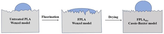 where θW is the actual contact angle, θY is the Young’s contact angle (the contact angle of an ideal smooth surface), and is the roughness coefficient (the ratio of the actual contact area to the apparent contact area). PLA is hydrophilic, and fluorination significantly increases its surface roughness (SR). According to the Wenzel model, a surface that is originally hydrophilic becomes even more hydrophilic when its roughness is increased. After heat treatment, the liquid wetting model may transform into the Cassie–Baxter model [38], where some areas are in solid–liquid contact, while others trap gas, forming a gas–liquid interface.