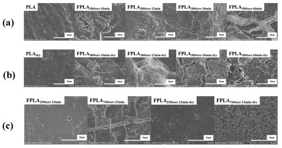 To observe the sample surface more accurately, SEM was used to directly analyze the morphology and surface changes. Figure 15 shows the surface SEM images of (a) untreated and fluorinated and (b) dried samples for different reaction times, as well as (c) fluorinated and (d) dried samples for different F2 contents. Untreated PLA has a smooth surface, similar to that of dried PLA. After fluorination, the surface became rough. For the short fluorination samples, a scaly surface structure began to appear. This is caused by C-Fx and C=OF generated during fluorination. The surface roughness changed consistently with the degree of reaction. However, the surface morphologies of the long-fluorinated samples changed dramatically. The scaly structure was replaced by numerous pores and cracks. This is consistent with the conclusion that the conversion of C-Fx to CF4 further damages the surface. Furthermore, the more severe the conditions, the deeper the damage. Therefore, the surface hydrophilicity increased with the degree of fluorination. After drying, the fluorinated samples exhibited a reduced scaly structure but a significant increase in pores. This is due to the thermal effects, which cause C-Fx to convert to CF4 and overflow from the surface, as well as the re-crosslinking of C=OF. This change was less pronounced in samples with long fluorination. This may be caused by excessive surface damage after fluorination. This cannot be offset by drying.