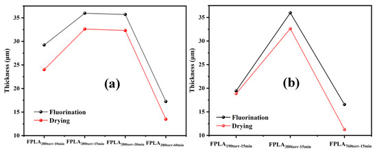 The thickness of the fluorinated layer was determined by elemental analysis of the sample sections. Figure 16 shows the SEM images of (a) untreated and fluorinated and (b) dried samples for different reaction times and (c) fluorinated and dried samples for different F2 contents. Figure 17 shows the thickness of the fluorinated layer for (a) different reaction times and (b) different F2 contents by elemental analysis. As shown in Figure 16, the thickness of the fluorinated layer of the fluorinated sample first increased and then decreased as the reaction time and F2 content increased. The thickness of the fluorinated layer is closely related to C-Fx. Consistent with the above analysis, F2 reacts with PLA during short fluorination and is continuously accumulated. Therefore, the thickness of the fluorine layer increased with the degree of reaction. However, during long fluorination, under the continuous attack of F2, some C-Fx is converted to CF4. CF4 escaped from the surface, causing the thickness of the fluorinated layer to decrease. Therefore, the thickness of the fluorinated layer decreased with increasing reaction rate. After drying, some C-Fx continued to convert to CF4 upon heating and overflowed the surface. Additionally, C=OF undergoes decarboxylation or re-crosslinking reactions. Therefore, the thickness of the fluorinated layer decreased further after drying.