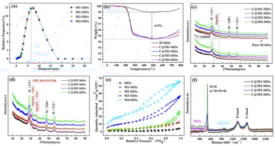 (a) PSD curves of M-SiOx, (b) TG curves of C@M-SiOx, (c) XRD Patterns of M-SiOx and C@M-SiOx, (d) Magnified XRD Patterns of C@M-SiOx, (e) N2 adsorption–desorption isotherms of M-SiOx, (f) Raman spectra of C@M-SiOx.