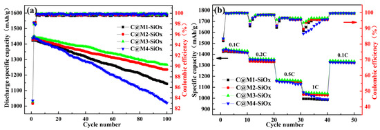 (a) Comparison of the cycling performance and Coulombic efficiency of C@M-SiOx at 0.1C, (b) Comparison of the rate performance and corresponding coulombic efficiency of C@M-SiOx.