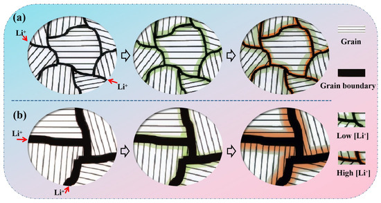 Schematic of a Li storage process into (a) Small grain particle and (b) Large grain particle.