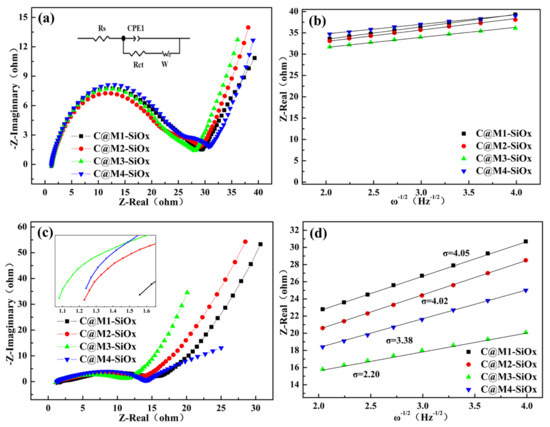 (a) Nyquist plots of C@M-SiOx after 2nd cycle, (b) Warburg factor analysis after 2nd cycle, (c) Nyquist plots of C@M-SiOx after 100th cycle, (d) Warburg factor analysis after 100th cycle.