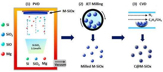 In this study, physical vapor deposition (PVD) was utilized to facilitate an in situ reaction between the magnesium source and silicon–oxygen components at elevated temperatures, leading to the formation of magnesium-doped SiOx. This approach effectively ensures the rapid and homogeneous distribution of magnesium within the material matrix, thereby overcoming the issues of non-uniform dispersion and local agglomeration typically associated with traditional mechanical mixing methods. Simultaneously, through the optimization of the reaction pathway, the occurrence probability of side reactions was markedly diminished, enhancing the controllability of the modification process. This reaction not only enables the incorporation of magnesium but also serves as a purification step, facilitating the acquisition of high-quality composite materials with enhanced compositional homogeneity and reduced structural defects. Subsequently, chemical vapor deposition (CVD) was employed to integrate the synthesized SiOx with a carbon framework. This integration successfully achieved the synergistic combination of multiple key techniques, including size regulation, structural design, element doping, disproportionation reactions, surface encapsulation, and multi-phase composite formation.
