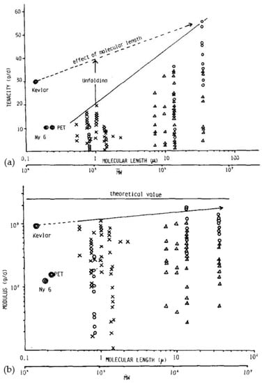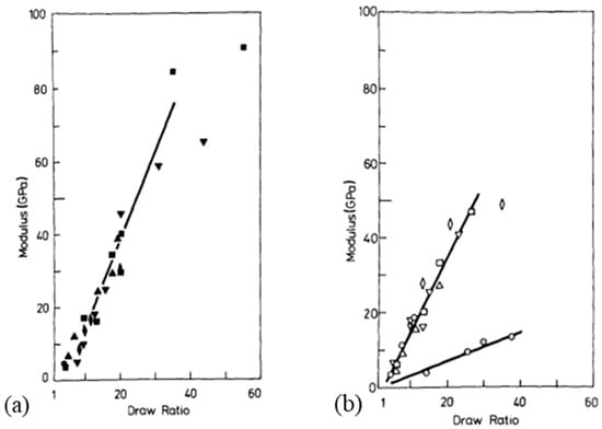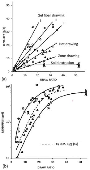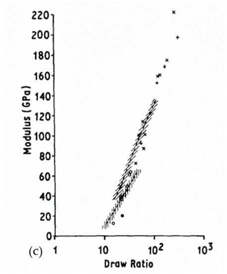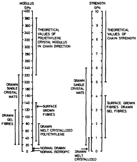 Several families of processes are used and all of them consist of a high drawing. What differentiates them is the state of the material at the beginning of the process. Quite different technologies certainly result. The hot drawing consists of stretching an extrudate, made from a molten polymer. The drawing temperature must be higher than the crystalline dispersion temperature, otherwise, ultra-stretched reinforcements (i.e., with a ratio higher than 20) are not possible. Chains folded into lamellae can then be stretched. The zone drawing technique is close to the previous one, but the heating of the stretched reinforcement is done locally with a device that moves along the fiber. This avoids the bending of the extended chains and prevents as much as possible the degradation of the polymer. Peterlin [] in his review was more interested in the molecular approach of drawing or extrusion. Barham and Keller [] proposed in their review a chronological history of the process of gel drawing from a solution. The first to attempt to stretch polymers to maximize their performance was a group of researchers at the University of Leeds in the 1970s [,,]. To create a frame of reference, Barham and Keller in their review [] proposed a scale that relates the mechanical properties to the kind of stretching (Figure 2). This one provided an idea of the theoretical values that could be achieved, and the real performance obtained.