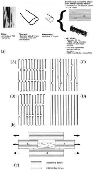 A description of a drawn macro fibril as a series of large crystal blocks interspersed with smaller, more disordered areas was put forward and taken up by several authors [,,,,]. This representation is shown in Figure 4c. These messier areas include entanglements and other defects such as chain ends and twists. The strength is thus attributed to the taut tie molecules in the disordered domain and the crystalline fraction that spreads the load. The elongation of the fiber at break is established by the elongation at break of the disordered domains but also of the crystal blocks. Finally, the tensile modulus can be defined as the ratio between the length of the crystal block and the disordered domains as well as the fraction of taut tie molecules []. As a result of experimental considerations, regions with defects are added to a model that includes extended chains and crystal regions in series []. The intensity of the charge transfer between the microfibrils is perceived in different ways. On the condition that the cohesion within them is more important than the lateral interactions between them, they act as structural entities. Gibson et al. [] suggested a crystalline tie model that accounts for this. Berger et al. [] provided an interesting schematic (Figure 4c) of the structural elements of a fibril where crystalline regions with stretched chains are connected by non-crystalline segments. The charge is then transmitted by shear at the interface between the blocks and thus probably not to adjacent crystals [,]. During the drawing step, crystalline perfection increases with the draw ratio and small, unstable fibrils break and reorganize. The structures’ diameters homogenize, to allow uniform load distribution across the diameter [].