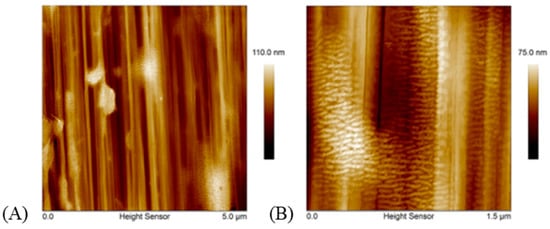 Observation of (A) the fibrillar structure on a surface of an S130 fiber (5 µm scan) and of (B) epitaxial patterns on the surface of the macro fibrils (1.5 µm scan) (reprinted with permission from ref. []. 2021 Roiron.).
