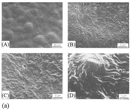 (a) Electron microscopic observations of the structure of an undrawn billet ((A) entire spherulites, (B,C) sheaf-like lamellae and (D) the core) (reprinted with permission from ref. []. 2021 Roiron.) (b) Electron micrographs of a drawn billet (disintegration of the spherulites at a draw ratio of 6 (A) and 7.5 (B), (C) zoom of (B), and (D) details of the lamellae) (reprinted with permission from ref. []. 2021 Roiron.).