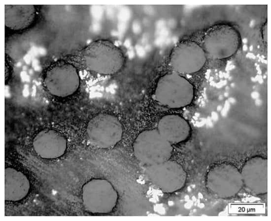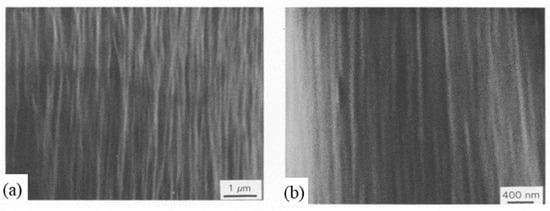 If a draw ratio of 7 is reached (Figure 6b), complete spherulites are few and the ordered rows disappear []. This results in a sample that becomes transparent due to the reduction in the size of the crystalline phase. Only predominantly oriented lamellae persist and some merge. The lamellae are more oriented, thinner, and longer than in the initial plot. Beyond a draw ratio of 12.6 (Figure 7), the lamellae undergo plastic strain allowing the appearance of microfibrils []. Some of them retain small waves that tend to disappear further down the die. Thus, thanks to the recrystallization induced by the strain during drawing, local melting, and plastic strain of the lamellae, fibrils can then be formed. During crystallization, the disordered chains thus change their structure to adopt a regular conformation in the crystalline phase [].