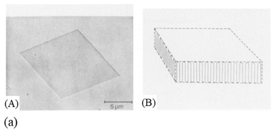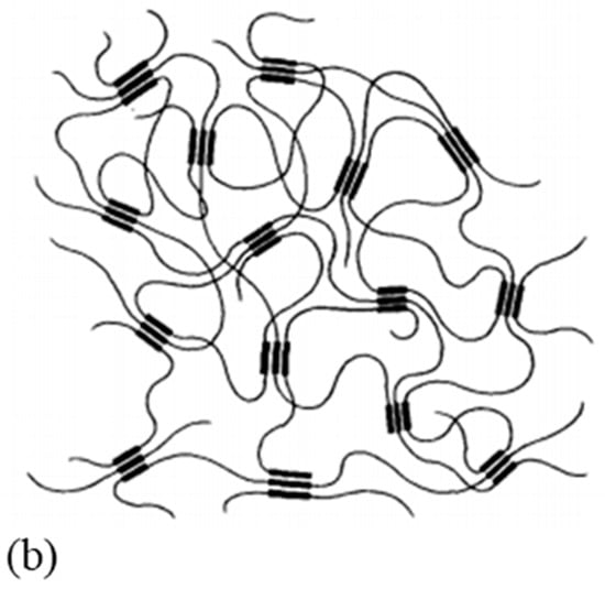 Illustration of (a) a polyethylene single crystal ((A) electron micrograph and (B) a sketch of the molecular arrangement), and (b) a gel with micellar junctions (reprinted with permission from ref. []. 2021 Roiron.).