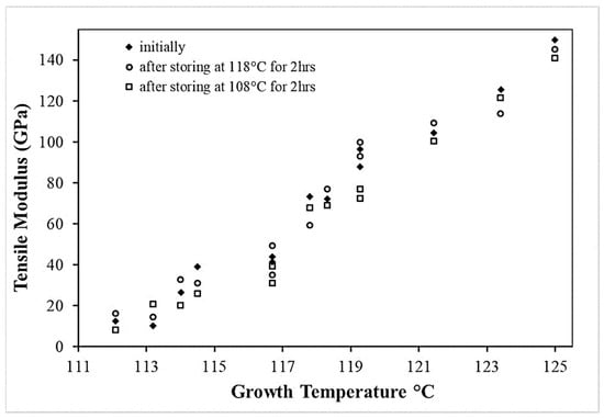 Dependence of the module on the growth temperature of shish-kebab structures, symbols refer to three different morphologies which can be obtained depending on the treatment after the formation (reprinted with permission from ref. []. 2021 Roiron.).