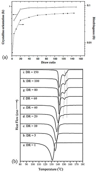 Influence of the draw ratio on (a) crystal orientation (∆) and birefringence (■) and also (b) on endotherms (reprinted with permission from ref. []. 2021 Roiron.).