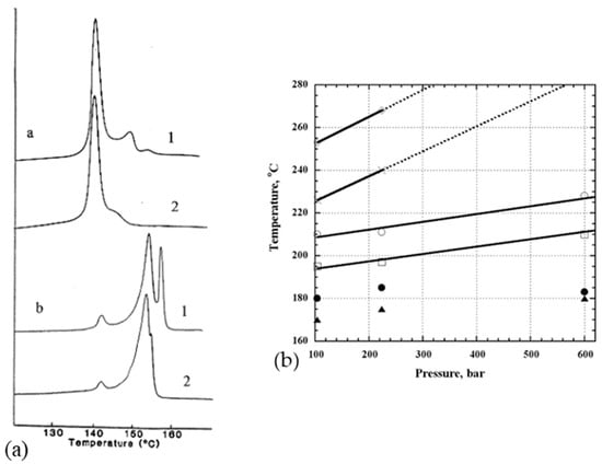 Also, crystallization at elevated pressure and temperature influences the morphology of the folded chains. At very high pressure, extended chain crystals can even be formed. Using X-ray diffraction analysis at the synchrotron, Rein et al. [] estimated that the melting temperature increased by 35.2 °C every kilobar. For example, at 100 bars, the reflections of the monoclinic (100) and orthorhombic (110 and 200) phases are visible at 100 °C. The monoclinic phase disappears at 177 °C and the hexagonal phase (100) appears at 179 °C. At 209 °C, the orthorhombic phase is no longer present, but traces of the hexagonal phase remain up to 250 °C. At 260 °C, the sample is fully amorphous. According to Figure 13b, stress can therefore stabilize the fibers against melting and thus increase the previously restricted application interval of the fibers since the orthorhombic to hexagonal transition occurs at higher temperatures as soon as pressure is applied []. However, other authors do not observe changes in the endotherms obtained for lateral pressures of several kilobars in DSC []. The melting process of constrained fibers can be described throughout a free energy diagram [].