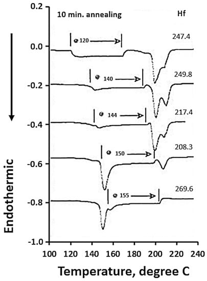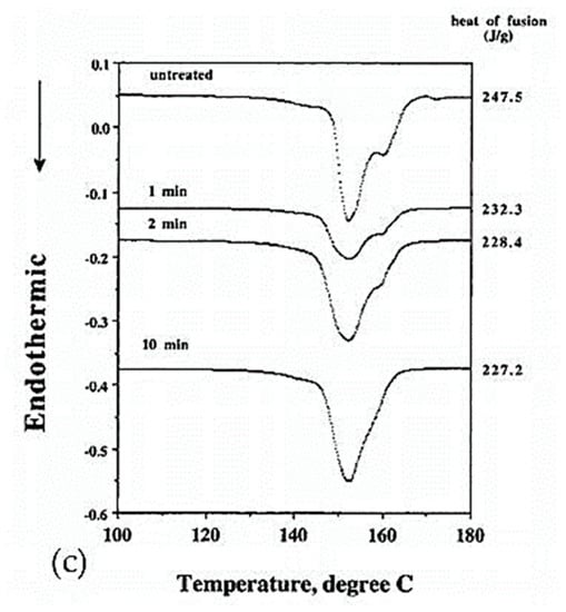The drawing process plays a role in the morphology obtained. Smook and Pennings [] noted a single discernible peak for undrawn fibers at around 137 °C, which then disappears in favor of two peaks at higher temperatures after drawing. The proportions of these two peaks, sometimes three, are modified according to the draw ratio. The peaks are associated with transitions and fusions of the orthorhombic, hexagonal, or pseudo-hexagonal phases. Comparing different results from the literature, the presence of these peaks is also a function of the process used []. Indeed, the endotherms of melt-spun and gel-spun fibers show differences. For the first process, a single peak even after drawing is visible [], whereas more peaks can be observed in the second case [,]. However, Dijkstra et al. [], only got one main endotherm for constrained gel-spun hot-drawn fibers.