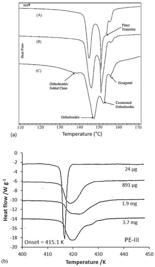 Constraining the fibers could be a means of increasing this limiting melting temperature. It seems that pressure increases the melting temperature and the onset of recrystallization. Indeed, several authors have analyzed the effect of hydrostatic pressure on phase transitions and the morphology of PE [,] in particular. More precisely, phase transition behavior is more or less affected by the history of the sample, depending on the setup and the way the sample is constrained. Thus, endotherms resulting from calorimetric tests are sensitive to the stress distribution in the sample. Also, they differ depending on whether or not the fiber, obtained from a gel, is stressed during the test. Tsubakihara et al. [] noted for the unconstrained sample a large pic around 143–144 °C (Figure 13a). It is related to the melting of extended chains under their unconstrained state. Whereas with the addition of a constraint, three peaks are observable: a small one at 143 °C, and two others at 155 and 159 °C, and it shows up more or less markedly with the molecular weight of the sample. So, constraining the specimen inhibits this melting process (Figure 13a), and Kwon et al. [] observed the same trends. This small peak is seen because of the melting of the stress-free taut tie molecules []. Complementary X-ray analyses have been performed, and they allow one to affirm that this peak at 155 °C is associated with the transition from the orthorhombic phase to the hexagonal phase. These two phases coexist between the second and third peaks. The temperature range over which they are both present depends on the molecular weight of the sample (Figure 13a). The main endotherm is shifted by 10 to 15 K with the addition of stress []. A brief thermal contraction and breakage of the sample are noticeable when the hexagonal phase melts. The hexagonal phase has a thermodynamic origin. As described briefly in a previous section, the heating rate influences also the calorimetric results. A decrease in the area of the transition and melting peaks of the hexagonal phase is especially noticeable. And the shift due to the overheating phenomenon, between heating rates of 0.3 and 5 K/min, is only 2 K [].