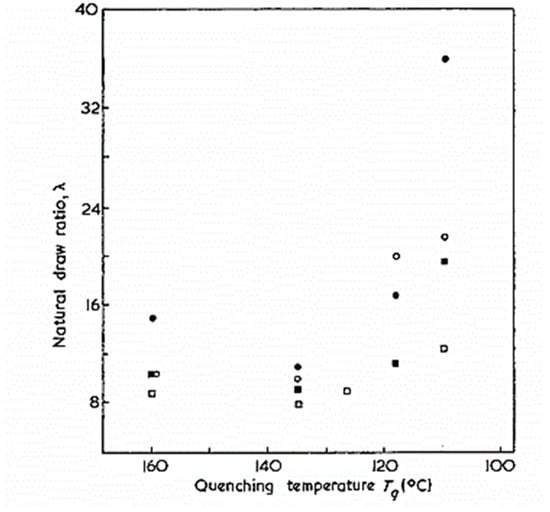 According to this representation into three steps of the deformation process for a cold-drawn specimen, the natural draw ratio thus corresponds to the draw ratio of the microneckage process. The model described can be applied to the hot drawing process but with some reservations. Indeed, the addition of temperature during the process leads to the random distribution of the destruction zones, a decrease of the tie molecules, a healing of the crystalline defects, and more mobile chains. Consequently, no yield strength is present. Li and Lee [] did not observe the plastic strain of spherulites. During solid-state extrusion drawing, the spherulitic structure initially present in the amorphous phase was transformed into a final structure composed of coalesced microfibrils separated by the amorphous phase.