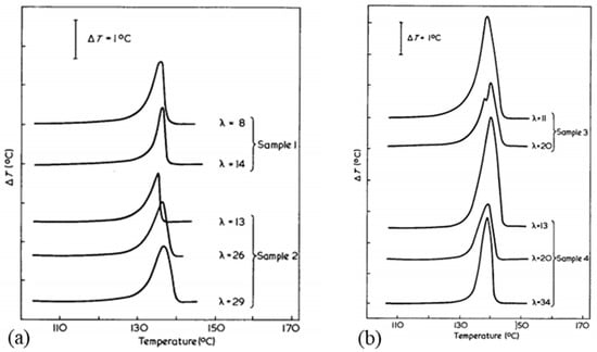 Peak values of the endotherms are strongly related to the heating rate in the DSC tests [,]. Hellmuth and Wunderlich [] studied the time dependence of the melting of the different crystals that form polyethylene. As the heating rate increases, the melting temperature of extended chains increases while that of the lamellar crystals decreases. In DSC, the tested fiber length in the capsule also impacts the peaks observed [], as well as the fixed elongation of the sample and the crystallization temperature [].
