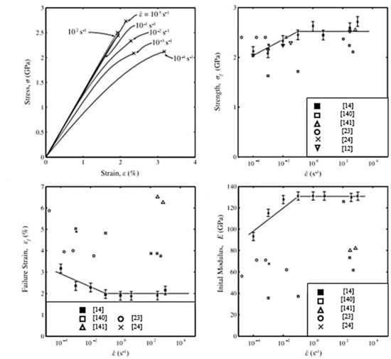 - Wang, Y.; Xia, Y.M. Experimental and theoretical study on the strain rate and temperature dependence of mechanical behaviour of Kevlar fibre. Compos. Part A Appl. Sci. Manuf. 1999, 30, 1251–1257. [Google Scholar] [CrossRef]