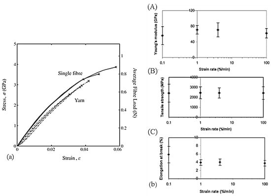Many authors have focused on studying unique fiber [,,,,,,,]. For several reasons related to experimental difficulties, which will be explained below, and because composite reinforcements are made of yarns or fabrics, some authors focus on yarns and not fibers [,,,,,,,,].