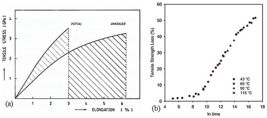 For applications exploiting SRP composites, if remarkable properties are desired, the reinforcement is only the component that takes up the load and ensures the mechanical performance of the part. To achieve superior properties from a basic polymer such as PE, it is necessary to orient and align the molecules (Figure 1a,b) []. By nature, all linear polymers can be solid and rigid due to the covalent bonds present. Concerning the optimum theoretical modulus achievable under ideal molecular alignment conditions, several values were proposed based on theoretical calculations and experiments on the calculation of crystallite stiffness [,]. Yeh et al. [] suggested that for a perfect PE crystal, a modulus of 324 GPa is attainable. However, many fibers on the market have properties that are about two orders of magnitude lower than the theoretical maximum properties, which would then be achieved if all the molecules chains were perfectly aligned and extended. The difference between theoretical and actual resistance can mainly be attributed to the presence of structural irregularities and the widespread tendency for chains to slip [].