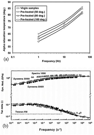 - Ohta, Y.; Yasuda, H. The influence of short branches on the α, β and γ-relaxation processes of ultra-high strength polyethylene fibers. J. Polym. Sci. Part B Polym. Phys. 1994, 32, 2241–2249. [Google Scholar] [CrossRef]