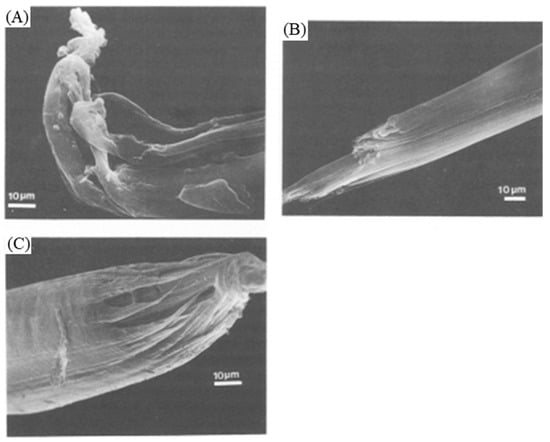 The cooling type as well as the length of time the material remains at the maximum temperature affects the size and spaces in the structure []. These latter characteristic parameters of the platelets can also be influenced after their development by storage at a given temperature below the initial fiber formation temperature. The formed fibers are “hairy” with loose hairs that are pendulous and capable of crystallizing into chains under the influence of cooling conditions. The hairs can metamorphose into platelets consisting of folded chains or smooth fibers []. A particular elongation flow in the case of drawing from a solution creates the conditions for the continuous growth of the fibers, which is necessary to produce shish-kebab structures. These conditions are not necessarily met in the case of traditional spinning where the draw ratios are not very high.