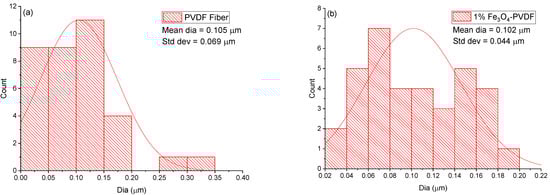 Scanning electron microscopy images of the fibers as a function of iron oxide concentration were analyzed using ImageJ software to calculate the diameter of electrospun fibers. The fiber diameter reduced gradually as the concentration of the Fe3O4 increased as shown in Figure 1 and Figure 2. The average fiber diameter reduced up to 26% for 5% Fe3O4-PVDF fiber. Similar results were obtained from electrospun PLA and PMMA fibers loaded with Fe3O4 nanomaterials []. At room temperature, Fe3O4 is a conductor material and adding the Fe3O4 particles into the PVDF solution increased the dielectric constant of the solution. A higher dielectric constant means higher polarity in the solution as well as a higher ability to stabilize the charges in the Taylor cone which leads to a decrease in nanofiber diameters []. O and Fe signals in the EDX chart of the fiber mats, shown in Figure 3, confirmed the presence of Fe3O4 in PVDF fiber. Au and Pd picks came from the sputter coated thin conductive film over the samples.