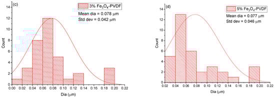 Average fiber diameter for (a) PVDF, (b) 1% Fe3O4-PVDF, (c) 3% Fe3O4-PVDF and (d) 5% Fe3O4-PVDF nanofiber mats.