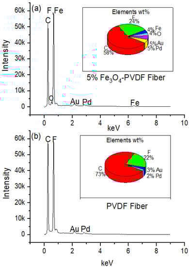 Qualitative EDS analysis of (a) 5% Fe3O4-PVDF and (b) PVDF nanofiber mats.