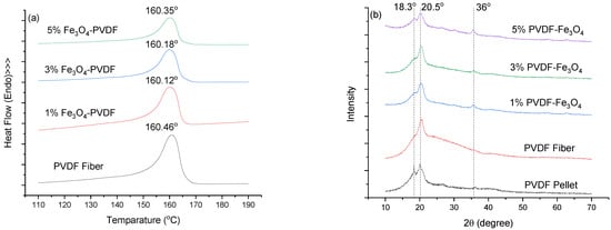 (a) DSC curves and (b) XRD curves for PVDF and Fe3O4-PVDF fiber mats.