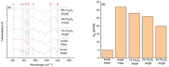 (a) FTIR spectra of PVDF and Fe3O4-PVDF fibers mats and (b) piezoelectric coefficient d33 of the fiber mats as a function of Fe3O4 mass fraction.