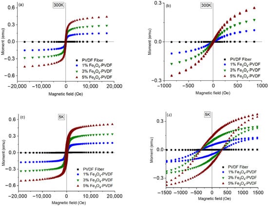 M–H measurements were done at 300 and 5 K with the magnetic field varying from −2 T to 2 T (1 T = 10,000 Oe; 1 Oe = 79.577 Am−1) as presented in Figure 6. At 300 K (Figure 6a,b), the samples showed zero coercivity, indicating that the nanofiber mats were in the superparamagnetic state. However, samples showed ferromagnetic behavior at 5 K with a coercivity of ~370 Oe for all the samples as shown in Figure 6c,d. Superparamagnetic materials can fluctuate randomly by thermal fluctuation at high enough temperatures just as an atom spin in paramagnetic materials. When the temperature is low, this thermal energy decreases and the magnetic moments are blocked []. The temperature below this happens known as blocking temperature which is 290 K as shown in Figure 7. Below the blocking temperature, there is some net alignment of the particle spins, while above it, the spins are in random directions which caused the hysteresis loops to appear at 5 K and increased the magnetic saturation value as shown in Figure 6d and Table 3 []. Previous magnetization measurements also indicated that the Fe3O4 particles are superparamagnetic at room temperature and ferromagnetic at low temperatures []. So, the composites made of Fe3O4 particles show similar characteristics.