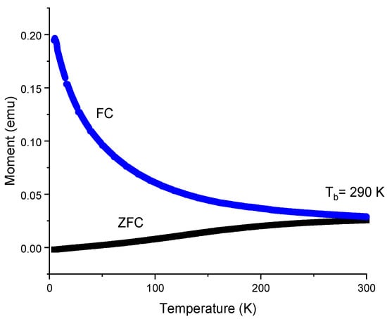 The magnetic moment vs. temperature (M–T) graph as shown in Figure 7, the separation of zero-field-cooled (ZFC) and field-cooled (FC) curves occur at large temperatures (blocking temperature Tb~290 K) indicating thermal irreversibility of the samples below room temperature. In a superparamagnetic state around 5 K, when the samples were cooled at zero applied field, the magnetic moments were randomly oriented leading to the total magnetization to be around zero as shown in Figure 7. When the temperature started to increase, magnetic moments began to fluctuate, and the presence of an externally applied field aligned them that led to the increase in the magnetization. Similarly, in the case of the field-cooled sample, the magnetic moments were aligned at a higher applied field resulting in higher total magnetization at 5 K starting to decrease with heating. These observations are in agreement with previously reported studies on Fe3O4 nanoparticles incorporation in other materials, including ceramic matrices [].