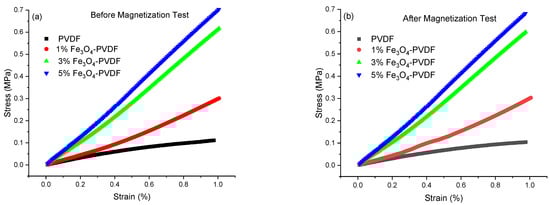 To see the stability of the fiber mats, DMA was done for all the samples before and after the magnetization test. Since the magnetization test of fiber mats was done at cryogenic temperature (5 K), it was important to determine their mechanical stability after the test. Dynamic strain sweep was done for all the samples as shown in Figure 8. The Young’s modulus (E) calculated from the stress–strain curves are listed in Table 4. The retention of modulus following cryogenic temperature exposure in composite samples over the PVDF which shows a slight decrease indicates that Fe3O4 helped the PVDF matrix to retain its mechanical property after being exposed to cryogenic temperature.