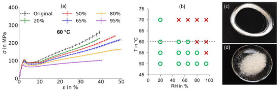 (a) Stress–strain curves of monofilaments subjected to artificial aging at 60 °C and indicated relative humidity (%) for two weeks. (b) Diagram of stability in terms of RH and aging temperature showing conditions which correspond to mechanically stable (green circles) and mechanically weakened/degraded (red crosses) samples after two weeks of treatment. The dashed line indicates the samples displayed in (a). (c,d) Images of mechanically intact and completely degraded monofilaments, respectively. The latter was treated under 70 °C and 95% RH for two weeks. Reprinted with adoptions from Ref [29].